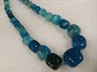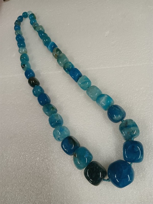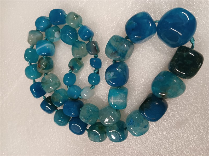 Výrazný náhrdelník s modrými chalcedony,kdy největší mají rozměry 2,5 x 2 cm. Kameny jsou pečlivě uzlíkovány . Délka náhrdelníku je 70 cm.