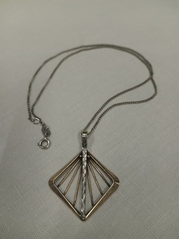 Výrazný retro náhrdelník vyrobený ze stříbra ryzosti 900/1000 , řetízek ryzosti 925/1000. Přívěsek je je po vnější hraně zlacený . Rozměry přívěsku jsou 4,2 x 3,3 cm . Délka řetízku je 42 cm . Celková hmotnost 6,36 gr.
