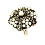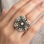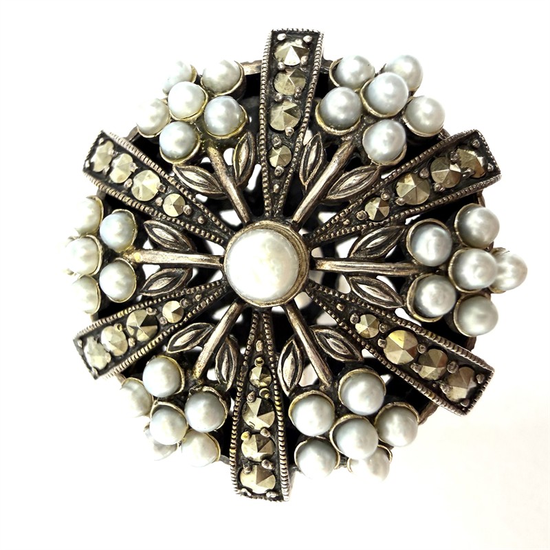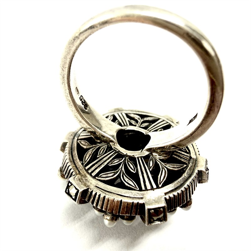Nevšední, nepřehlédnutelný stříbrný prsten. Šperk zdobí drobné, sněhobílé perly kontrastně dozdobené elegantně se třpytícími markazity. Prsten nese neobvykle ztvárněný florální motiv. Stříbro sterlingové ryzosti 925/1000, váha 10,66 g. Velikost 56. Průměr dekorativní hlavice 2,5 cm. Šperk je v perfektním stavu.