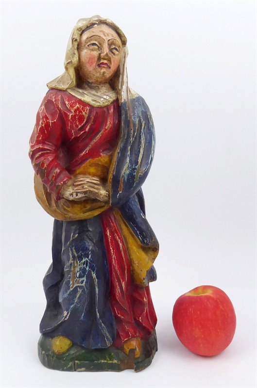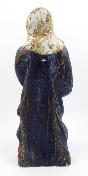 Dřevořezba, polychromie. Přiloženo osvědčení Národního památkového ústavu České republiky. Rustikálně pojatá dřevěná socha Panny Marie Bolestné, jež byla dříve zřejmě součástí Kalvárie. Panna Maria je vyřezána v čelním pohledu s rukama svěšenýma a sepjatýma. Hlava s bílým závojem mírně pozvednuta. Oděná je ve splývavý červený šat, přes něhož je přehozen modrý plášť se žlutou podšívkou. Zadní strana plně opracována. Na nízkém zeleném podstavci. Střední Evropa, 20. století. Výška 40 cm.
