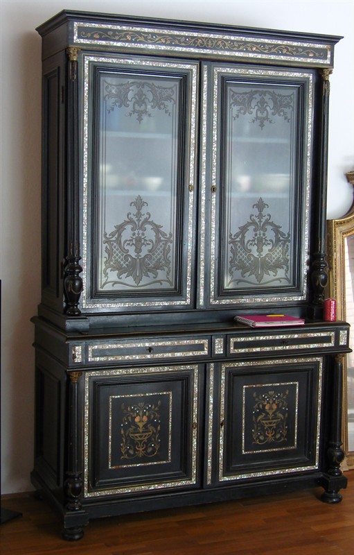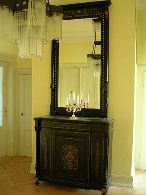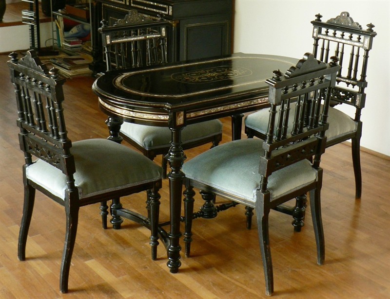 Velký skleník, manžetník, stůl a 4 řidle, komoda s mramorovou deskou a velké zrcadlo. Francie, styl Napoleona III. Stůl a manžetník a zrcadlo restaurováno. Ostatni v uživatelném stavu. Tento nábytek můžete často potkat na našich Zámcích, u šlechty byl oblíbený. Např. zámek Červená Lhota, Nelahozeves. Ebenové dřevo vykládane mosazí, perletí a želvovinou. Zašleme další detailní fotografie.