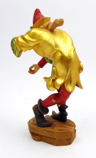 Dřevořezba, polychromie, zlacení. Kopie ze série slavných Moriskentänzer (tanečníků Morrisova tance). Autor originální předlohy: Erasmus Grasser (1450-1518) slavný německý pozdně gotický řezbář, sochař a architekt. Jeho nejznámějším, světově proslulým, dílem jsou právě tito tanečníci. Sérii v originálu vysokých soch z lipového dřeva vytvořil pro taneční sál Staré radnice v Mnichově. Název figury: Zattelrock (špičatá sukně) - Tanečník ve špičaté sukni. Výrobce: Řezbářství J. Heinrichmeyer, Rimbach, Německo. Dřevořezba tanečníka ve vysoké čepici oblečeného do zlatavého oděvu se sukní se špicemi. Červené punčochy s rolničkami i stejně barevné rukávce a černé dobové špičaté boty. Na stylizovaném reliéfním podstavci. Německo, Rimbach, minulé století. Výška 25 cm, rozměr podstavce 10 cm x 8,5 cm.