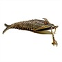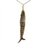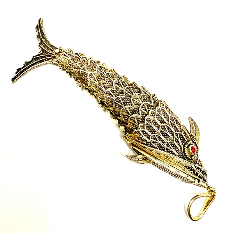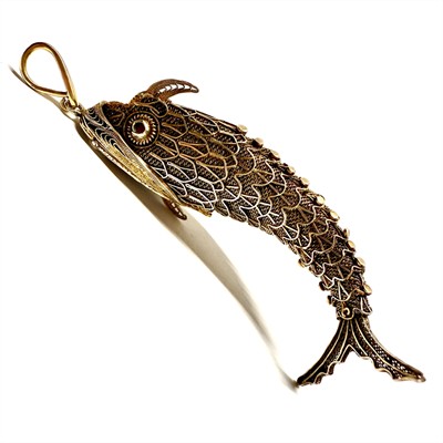 Větší, otvíratelný závěs ze zlaceného stříbra zhotovený pracnou ruční technikou filigránu - ryba. Závěs je otvíratelný - do břicha se vkládala vatička s vonnou esencí. Tělo ryby je složeno z jednotlivých článků a je pružné. Stříbro ryzosti 925/1000, celková váha 14,17 g. Délka 9 cm. Výborný stav. Řetízek není součástí prodeje.