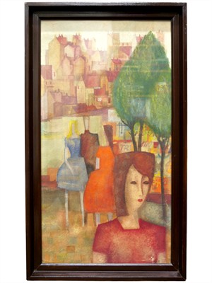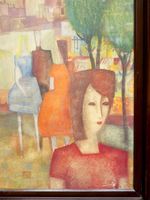 Akvarel na kartonu. Obraz zachycuje scénu ve stylu fauvismu s výraznými barvami a stylizovanými postavami. Stylisticky se vyznačuje zjednodušenými formami a teplou paletou barev, které vytvářejí živou a emotivní atmosféru. Mírně kubizující. Rozměry s rámem jsou 25,5 x 43,5 cm. Bez rámu 21 x 39,5 cm.