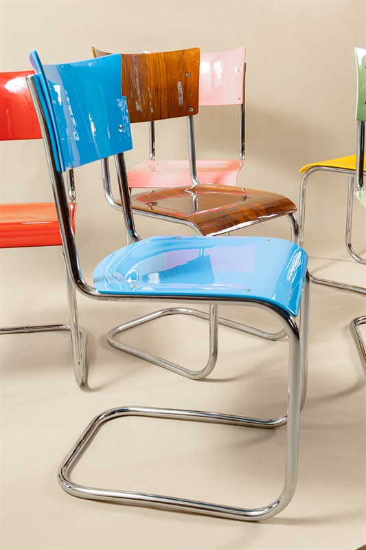 Datování-1930. Období-Funkcionalismus. Styl-Bauhaus. Původ-Československo. Materiál-ocelová trubka, překližka buk. Rozměry-v80. š40. h50. Cena křeslo kus-14500 Poznámka-barvu i počet židlí připravíme na základě vašeho požadavku. Doručení-po předchozí dohodě.