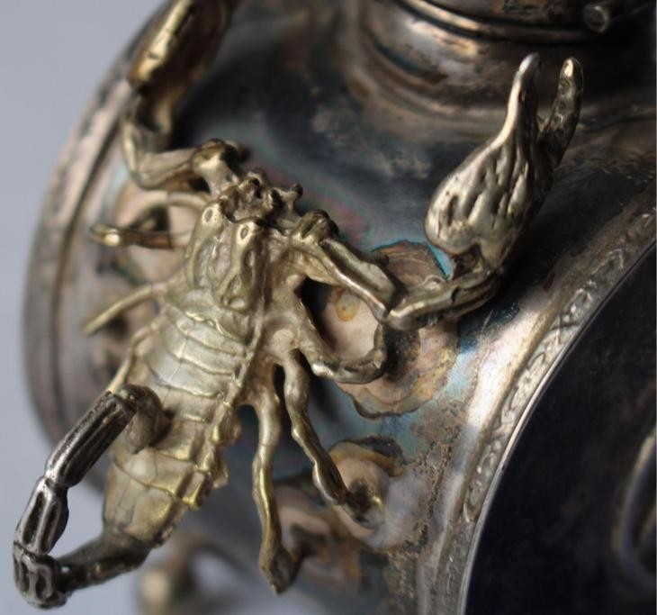 Židovsko rusky stříbrný kalamář - puncováno Židovsko rusky Starožitný stříbrný kalamář - puncováno Starožitný kalamář vyrobený v roce 1844. Tělo bubnového tvaru, podepřené čtyřmi patkami. Přední strana s dvouhlavým orlem, zadní s Davidovou hvězdou. Po stranách bubnu dva plíživý štíři útočící na přihrádku s víkem. Krásný kousek. Puncováno v roce 1884. Váha 152,1 g. Petrohrad 1857, mistr punců TT, tvůrce Pavel Sazikov,Puvodni cena je:1000 Liber
