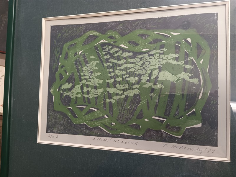 Kombinovaná technika pod sklem - Zimní hladina , Fr. Hodonský 83 . Celkový rozměr 48 x 42 cm .