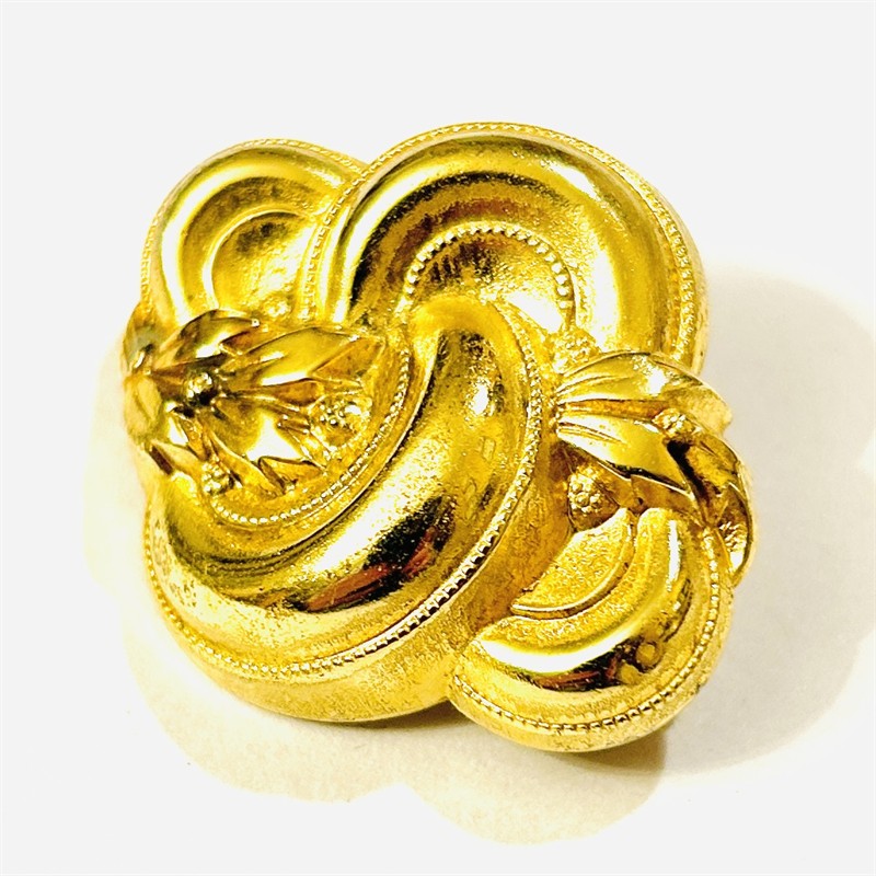 Starožitná brož z období biedermeieru v podobě stylizovaného uzlu s propleteným listovým s malými piniovými šiškami. Kvalitní středoevropská zlatnická práce z poloviny 19. století. Vyrobeno technikou dutého kovu. Zhotoveno ze silně zlaceného obecného kovu; neznačeno. Hmotnost 4,42 g, délka 37 mm, šířka 31 mm. Zapínání na "C" sponu v pořádku, lehké stopy nošení, jinak v dobrém stavu, odborně vyčištěno a vyleštěno zlatníkem.