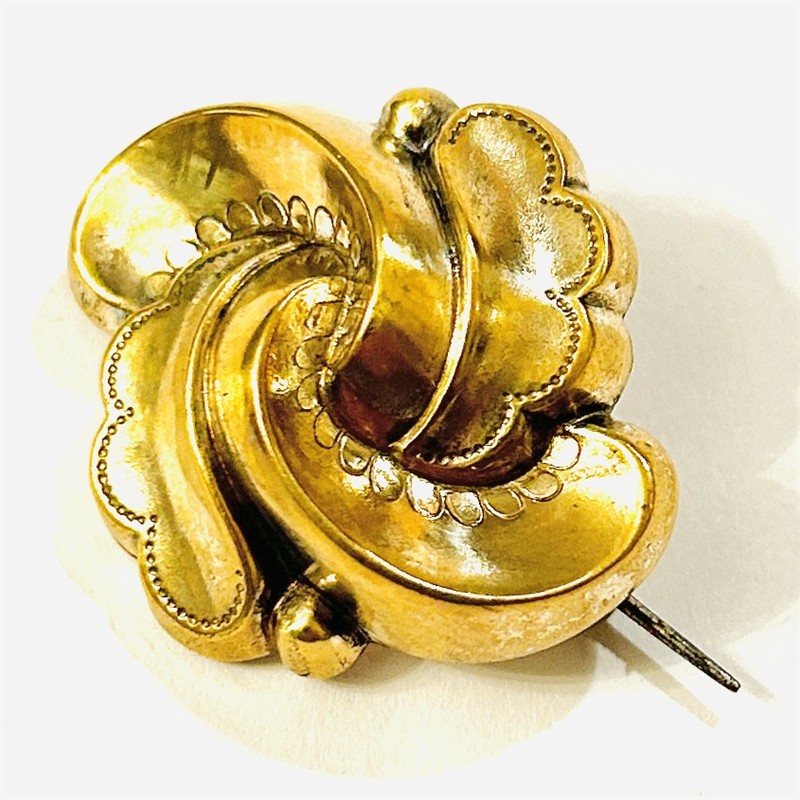 Starožitná brož z období biedermeieru v podobě stylizovaného uzlu, jednotlivé plastické části inspirované florální estetikou, zdobeno rytím. Kvalitní středoevropská zlatnická práce z poloviny 19. století. Vyrobeno technikou dutého kovu. Zhotoveno ze silně zlaceného obecného kovu; neznačeno. Hmotnost 5,69 g, délka 33 mm, šířka 28 mm. Zapínání na "C" sponu v pořádku, nepůvodní jehla, stopy nošení, jinak v dobrém stavu, odborně vyčištěno a vyleštěno zlatníkem.