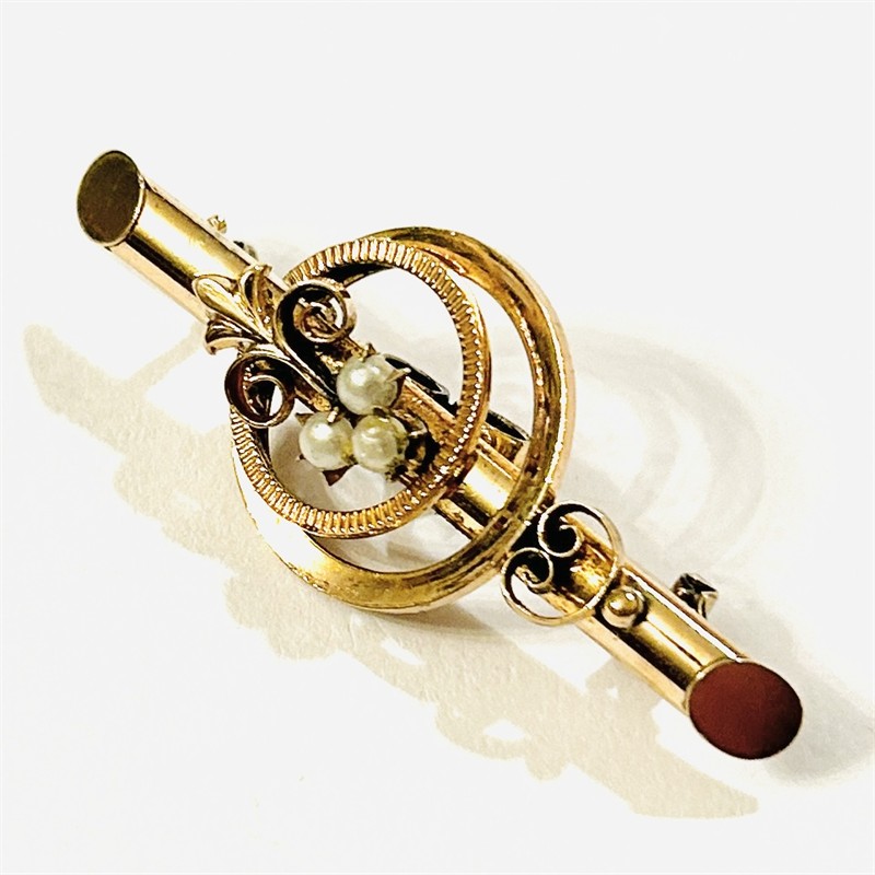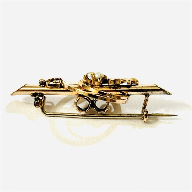 Elegantní brož, jež slouží též jako jezdec na jeptiškový řetěz. Tělo ve tvaru dříku se skosenými konci, centrální kružnicová aplikace s volutami a trojlistem osazeným přírodními bílo-šedými perlami (půlperly). Západoevropská práce z přelomu 19. a 20. století. Zhotoveno z double, tedy obecného kovu potaženém silnou vrstvou zlata; neznačeno. Hmotnost 3,09 g, délka 40,5 mm, šířka 17 mm. Zapínání na "C" sponu v pořádku, dvojitý průvlek pro řetízek. V zachovalé stavu, odborně vyčištěno a vyleštěno zlatníkem.