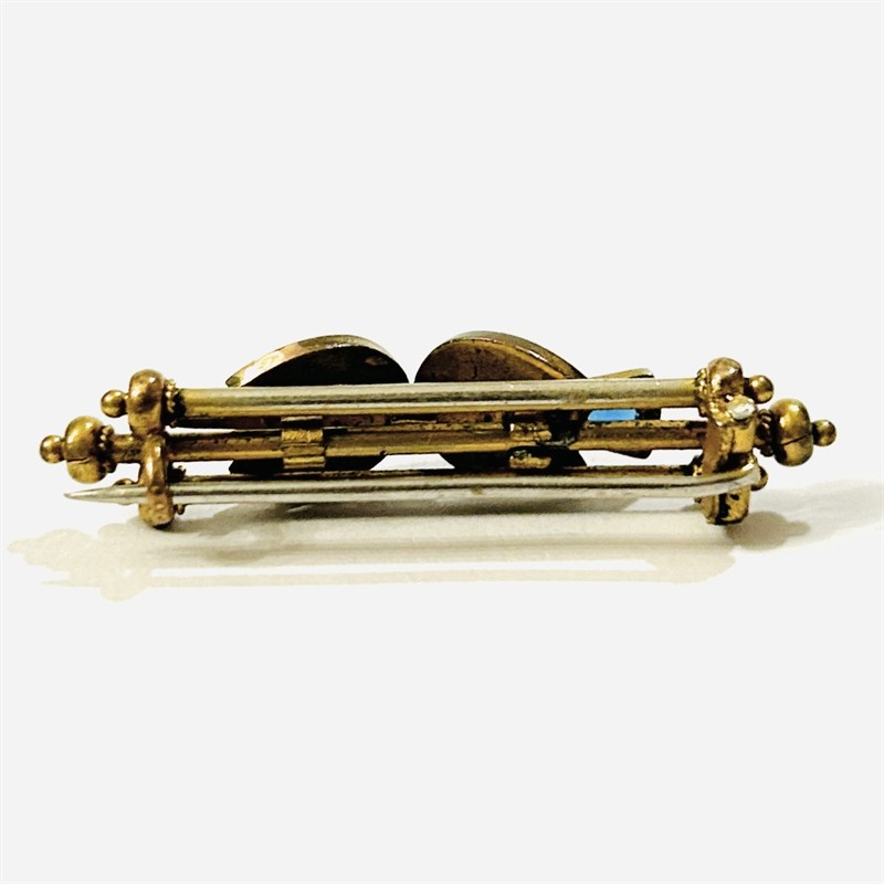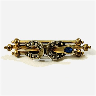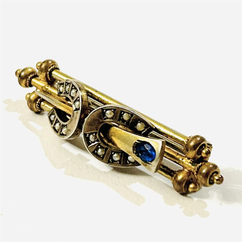 Starožitná brož tělem ze tří dříků se zdobnými hlavicemi, hravá posuvka s dvěma podkovami osazenými přírodními bílými perlami, propojeno jehlou se syntetickým modrým safírem oválného brusu. Nevšední šperk s tradičním motivem štěstí, Kvalitní středoevropská zlatnická práce z konce 19. století. Zhotoveno ze zlaceného obecného kovu, perly fasovány ve stříbře; neznačeno. Hmotnost 5,41 g, délka 42,5 mm, šířka 9 mm. Zapínání na "C" sponu v pořádku, zlacení místy setřeno, lehké stopy nošení, jinak v zachovalém stavu.