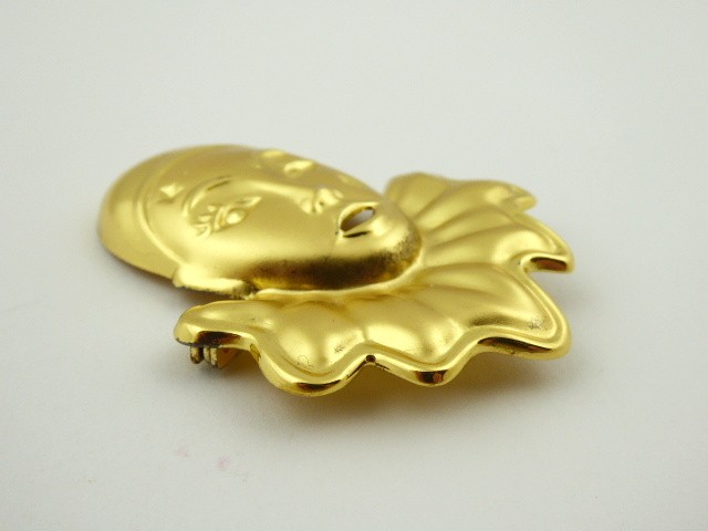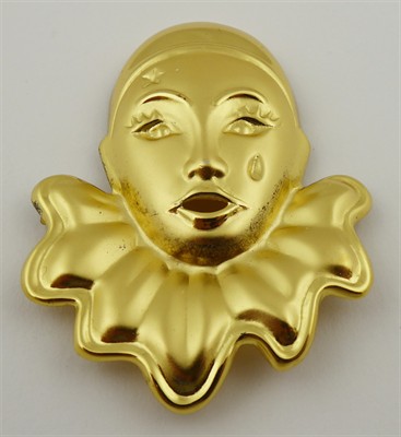 Zlacené stříbro vysoké ryzosti. Ryzost Ag 925/1000, celková hmotnost 8,50 g. Zlacená stříbrná reliéfně tvarovaná brož do podoby melancholického milovníka Pierota - původní postavy francouzského lidového divadla a pantominy, kde spolu s Kolombínou a Harlekýnem působil v commedii del´arte. Značeno: ryzost 925 a mistrovská značka. Itálie, Vicenza, konec minulého století. Výška brože 60 mm, šířka brože 45 mm.