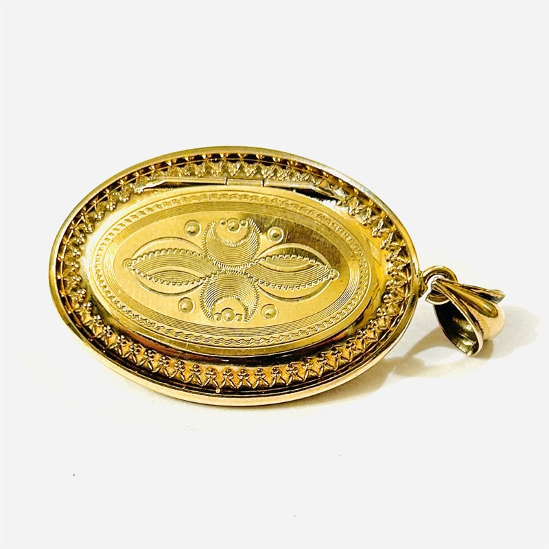 Honosný přívěšek sloužící i jako medailon na fotografie, oválně tělo bohatě plasticky tvarováno a dekorováno ve stylu pozdního biedermeieru. Frontální část v kontrastním lesklém a matovaném zlatavém odstínu, ve středu osazena v mnohokrapnové koruně bílým kamenem, víčko při zadní straně zdobeno jemným gilošováním. Prostor pro fotografii podložen purpurem a opatřeno krycími sklíčky. Kvalitní západoevropská zlatnická práce ze 3. čtvrtiny 19. století. Zhotoveno ze zlatavé slitiny stříbra o ryzosti 450/1000, ouško ze zlata, vnitřní rámečky z obecného kovu; neznačeno. Hmotnost 9,51 g, celková délka 49,5 mm, šířka 26 mm. Zavírání v pořádku, jedno z krycích sklíček prasklé, nepůvodní osazení kamene, jinak v zachovalém stavu.