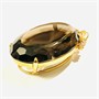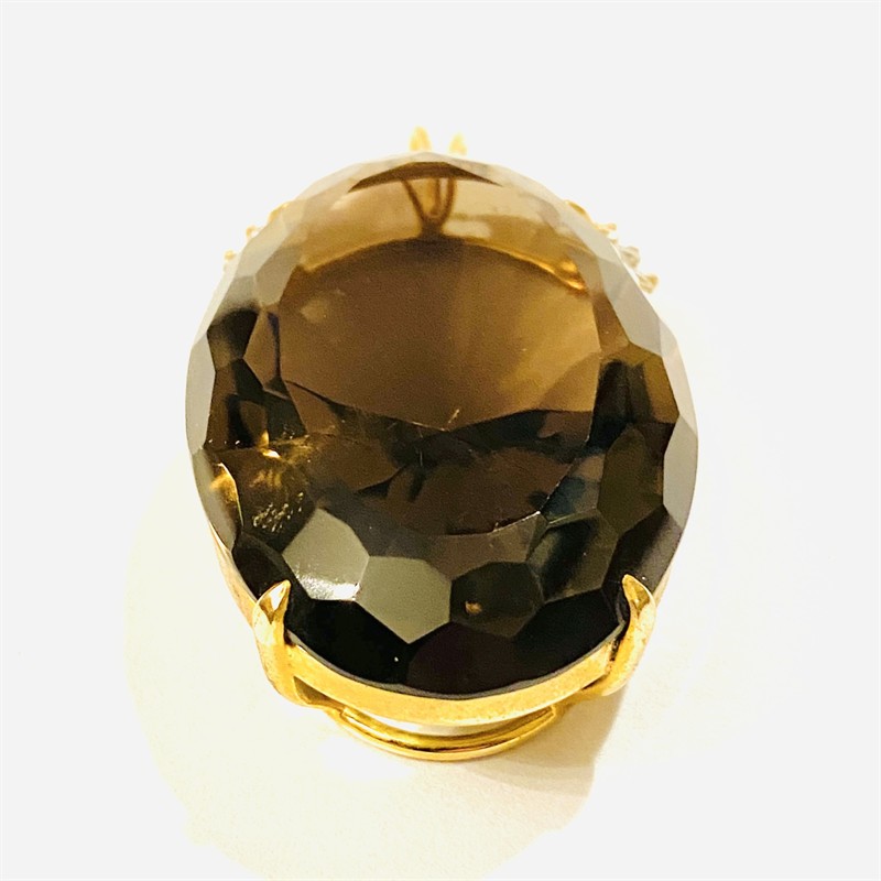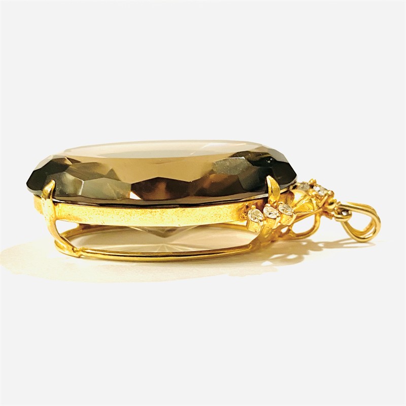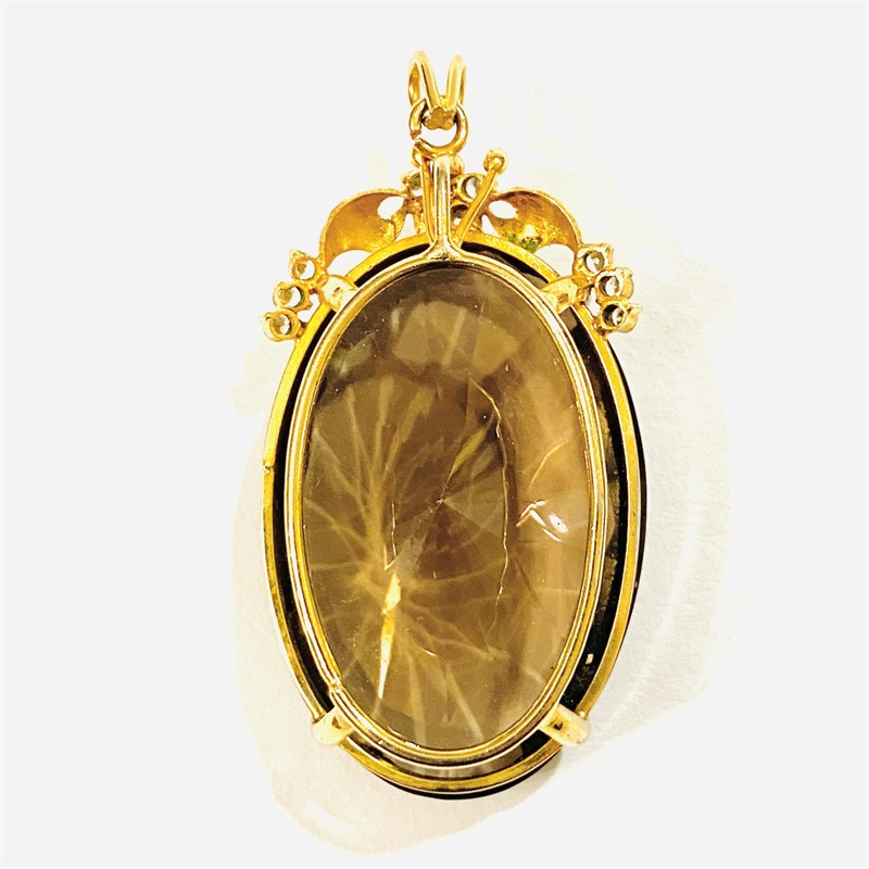 Výrazný, extravagantní závěs osazený velkou přírodní tmavší záhnědou oválného brusu (délka 45 mm), zasazeno v rámečku s florálně dekorativním frontonem osazeným čirými kameny kulatého brusu. Kvalitní zlatnická, patrně asijská práce z poslední čtvrtiny 20. století. Zasazeno ze zlaceného obecného kovu; neznačeno. Hmotnost 31,43 g, celková délka 61 mm, šířka 31 mm. V zachovalém stavu. Přírodní původ kamene ověřen u gemologa.