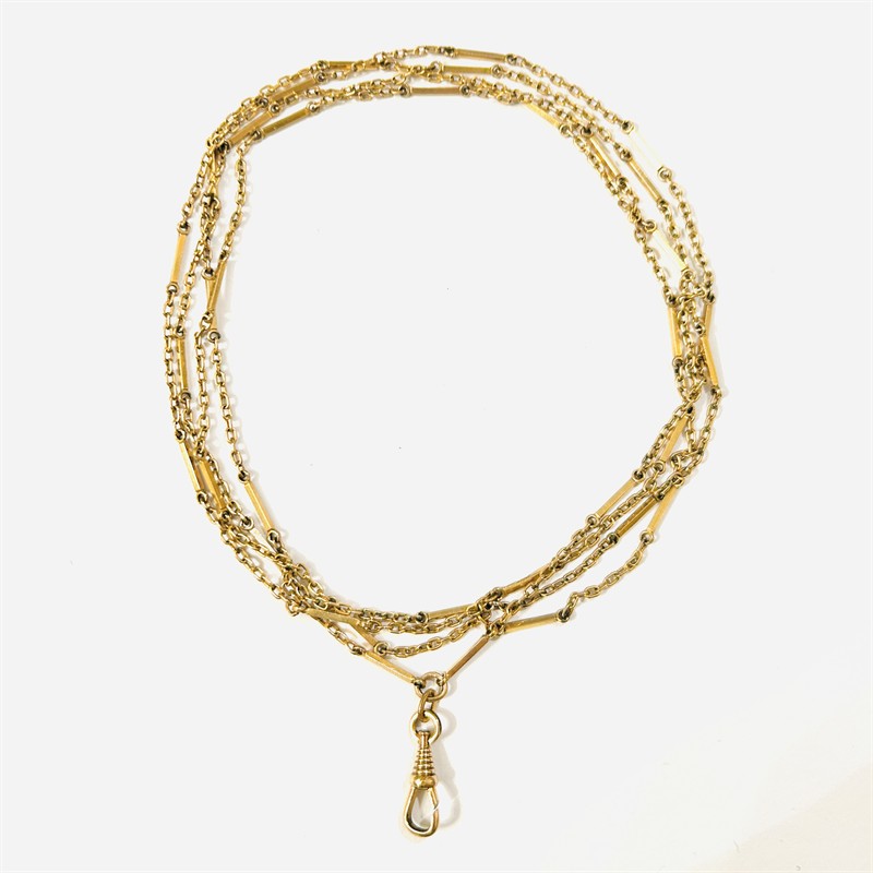 Starožitný dlouhý řetízek určený původně k dámským kapesním hodinkám (jeptiškám), lze však variabilně využít či obtočit. Decentní vazba s řetízkovinou "anker" a podlouhlými čtvercovými články v průřezu, zakončeno karabinou pro zavěšení čí připnutí. Kvalitní šperkařská práce pforzheimského výrobce Kollmar & Jourdan z počátku 20. století. Zhotoveno z double (obecného kovu potaženého silnou vrstvou zlata); značení "DOUBLE" a značka výrobce "KJ" na puncovní destičce. Hmotnost 11,66 g, délka 142 cm, šířka vazby 1 mm. Karabinkové zapínání v pořádku, celkově v zachovalém stavu.