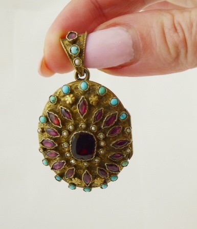 Zlacené stříbro, přírodní tyrkysy, přírodní almandiny a říční perličky. Větší oválný otevírací medailon ze zlaceného stříbra ze Sedmihradska (Transylvánie) sídla proslulého hraběte Draculy (Vlad III.). Uprostřed s velkým oblým přírodním ručně broušeným almandinem obklopeným říčními perličkami, dalšími menšími almandiny ručně broušenými do tvaru okvětních lístků a přírodními tyrkysy. Lícová i rubová strana medailonu dekorovaná gravírovanými ornamenty. Uvnitř medailonu prostor pro fotografii či jiný upomínkový malý předmět. Originální šperk, zajímavý i po sběratelské stránce. Značeno: rakousko-uherský vídeňský punc pro cizí zboží. Sedmihradsko (Transylvánie) 1868 - 1880. Výška medailonu včetně zdobného oka 55 mm, šířka medailonu 34 mm.