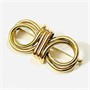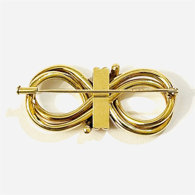 Elegantní brož z období art-deco ve tvaru stylizované, až futuristicky pojaté mašle, dynamické křivky pracující s kontrastním zbarvení kovu. Tuzemská klenotnická práce z 30. či 2. poloviny 40. let 20. století. Zhotoveno ze žlutého a červeného 14 karátového zlata, tj. o ryzosti 585/1000; prvorepublikový punc Z-45 (český lev 4), ryzostní číslo a mistrovská značka "VH" na jehle. Hmotnost 7,44 g, délka 45,5 mm, šířka 25,5 mm. Zapínání včetně trombónové pojistky v pořádku, ve velmi zachovalém stavu, odborně vyčištěno.