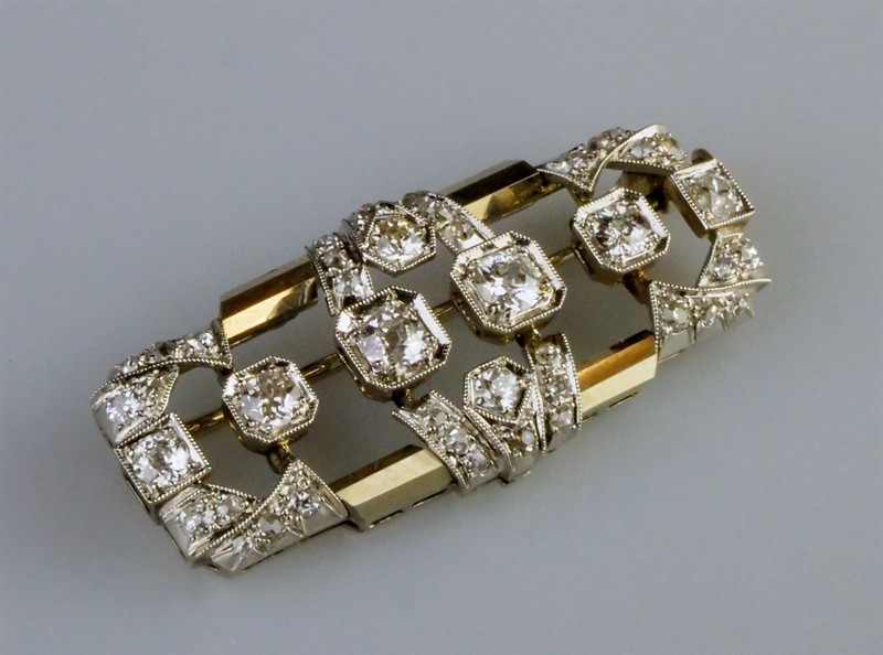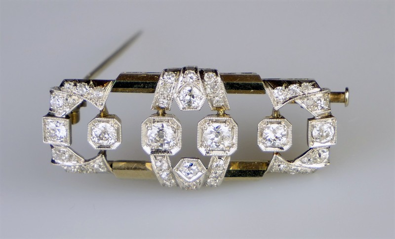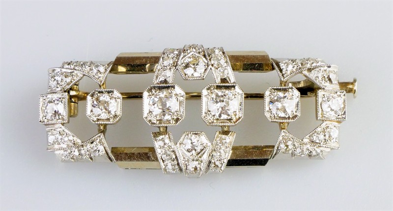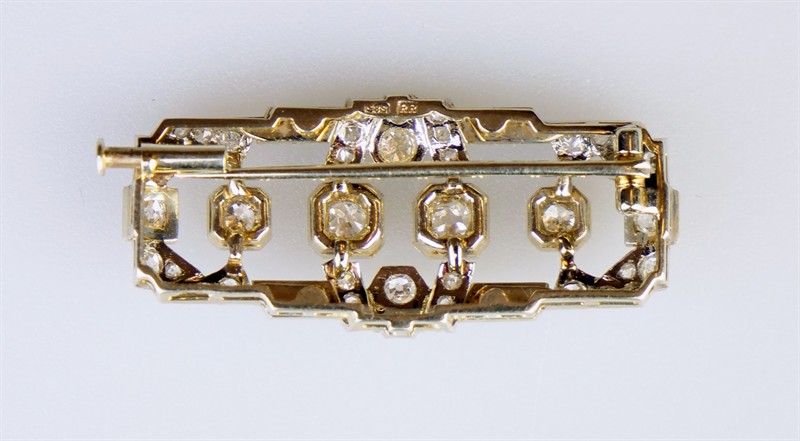 Půvabná stylová art-deco brož z bílého zlata s diamanty. 12 x diamant starého briliantového brusu, 30 x diamant jednoduchého brusu, celkem 1,52 ct diamantů dobré až střední kvality. Celková hmotnost 9,14 g, Au 585/1000, punc lev (Z – 45), značka výrobce RR v kartuši, odborný posudek. Republika Československá, 30. léta 20. století. Délka 4,06 cm, šířka 1,79 cm.