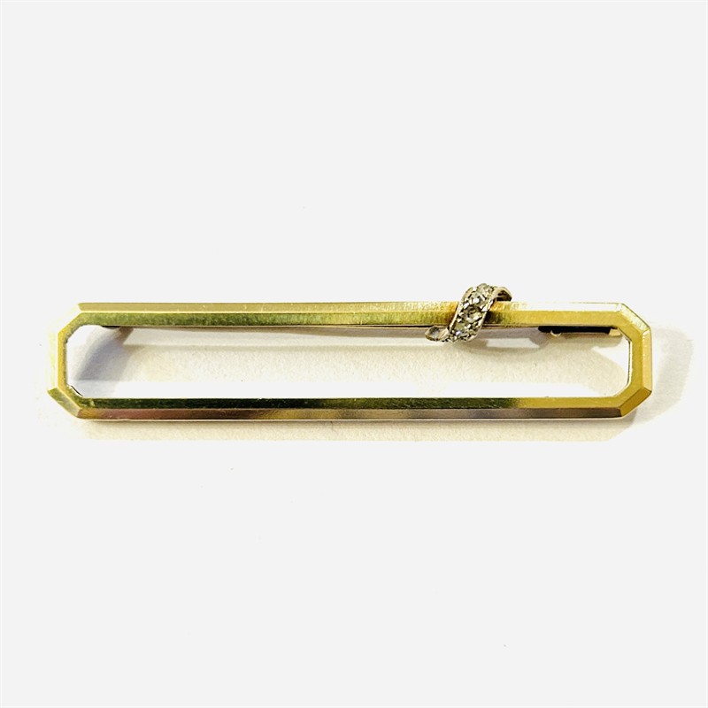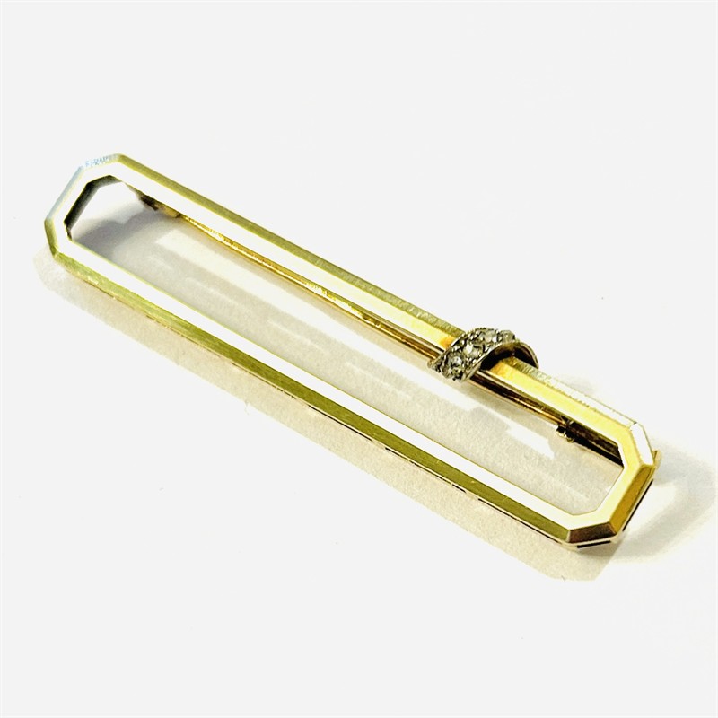 Elegantní, minimalistická brož z období art-deco. Geometricky pojaté fazetované tělo je zvýrazněno o vinutý pásek z bílého zlata, který je osazen 5 přírodními diamanty routového brusu. Opatřeno četnými průsvitkami. Nadčasový šperk, středoevropská klenotnická práce z 30. let 20. století. Zhotoveno ze žlutého bílého 14 karátového zlata, tj. o ryzosti 585/1000; nově opatřeno puncem Z-58 (labuť 4) z boku. Hmotnost 5,54 g, délka 51 mm, šířka 10 mm. Zapínání včetně trombonové pojistky v pořádku. Celkově ve velmi zachovalém stavu.