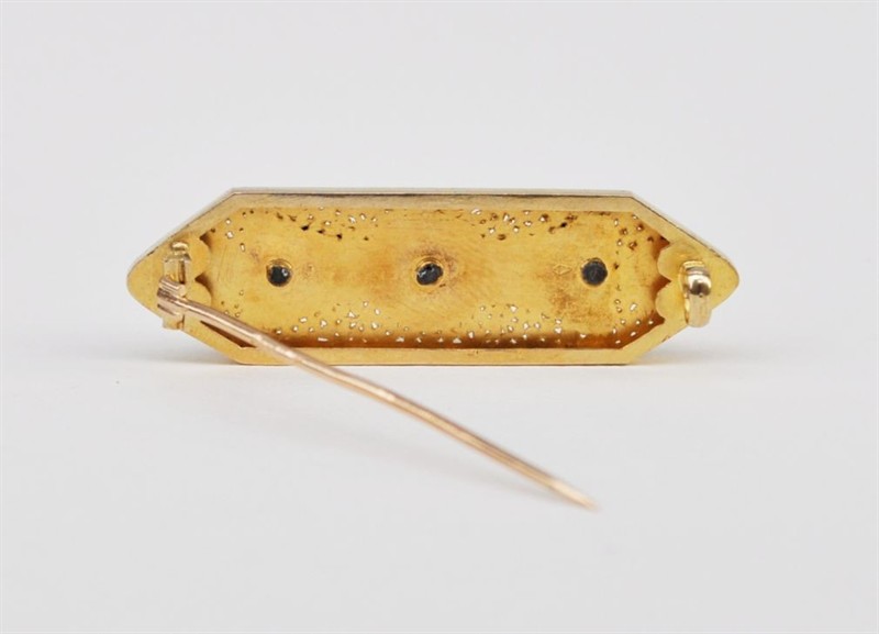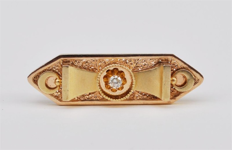 Zlatá biedermeierová brož s diamantem briliantového brusu 0,2 ct, zdobena plastickým gravírováním, matované a leštěné zlato. Celková hmotnost Au 6,94 g/580/000, punc liška (Z – 27), Vídeň. Rakousko-Uhersko, poslední třetina 19. století, délka 5,1 cm, šířka 2 cm.