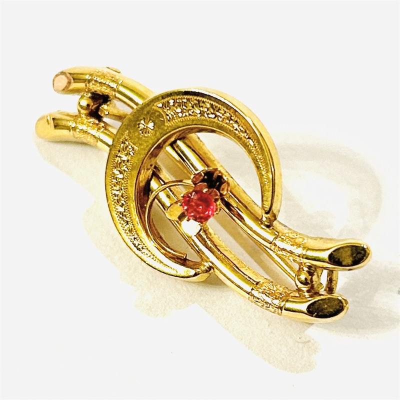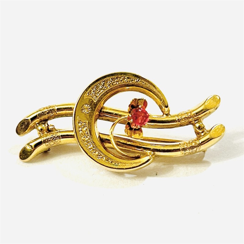 Elegantní brož z období doznívajícího biedermeieru, tělo tvořené dvěma zvlněnými liniemi s vystupující aplikací ve tvaru srpku měsíce, centrální květ osazený světle rubínovým sklem kulatého brusu fasovaného v mnohokrapnové koruně, místy zdobeno jemným rytím. Kvalitní středoevropská zlatnická práce z 50. až 60. let 19. století. Zhotoveno ze žlutého 11,3 karátového zlata, tj. o ryzosti 470/1000, zapínáni z obecného kovu; vyhotoveno osvědčená puncovního úřadu, neznačeno. Hmotnost 2,57 g, délka 35 mm, šířka 16 mm. Zapínání na "C" sponu v pořádku, v jednom místě lehká promáčklina, není téměř patrné, jinak celkově v zachovalém stavu, odborně vyčištěno vyleštěno zlatníkem.