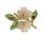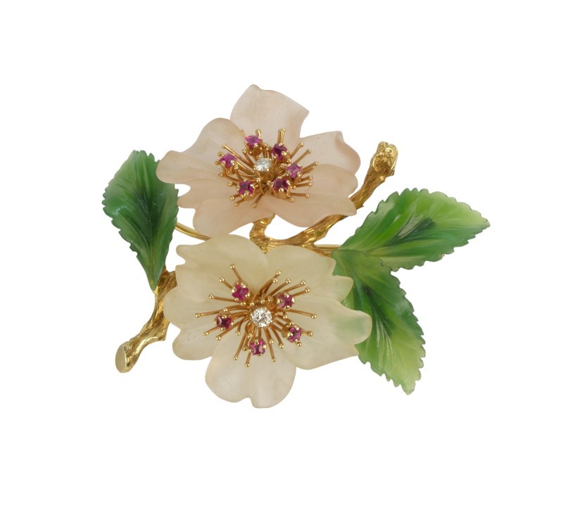 Brož ze žlutého zlata ryzosti 585/1000 - motiv dvou květů se zelenými lístky. Květy a lístky z horského křišťálu a nefritu, zdobeny dvěma briliantky a syntetickými rubínky. Rozměr brože 5 x 4,3 cm, celková hmotnost 17,34 g.