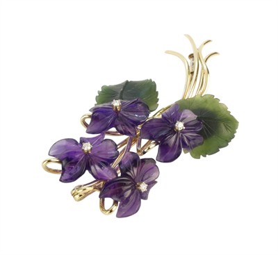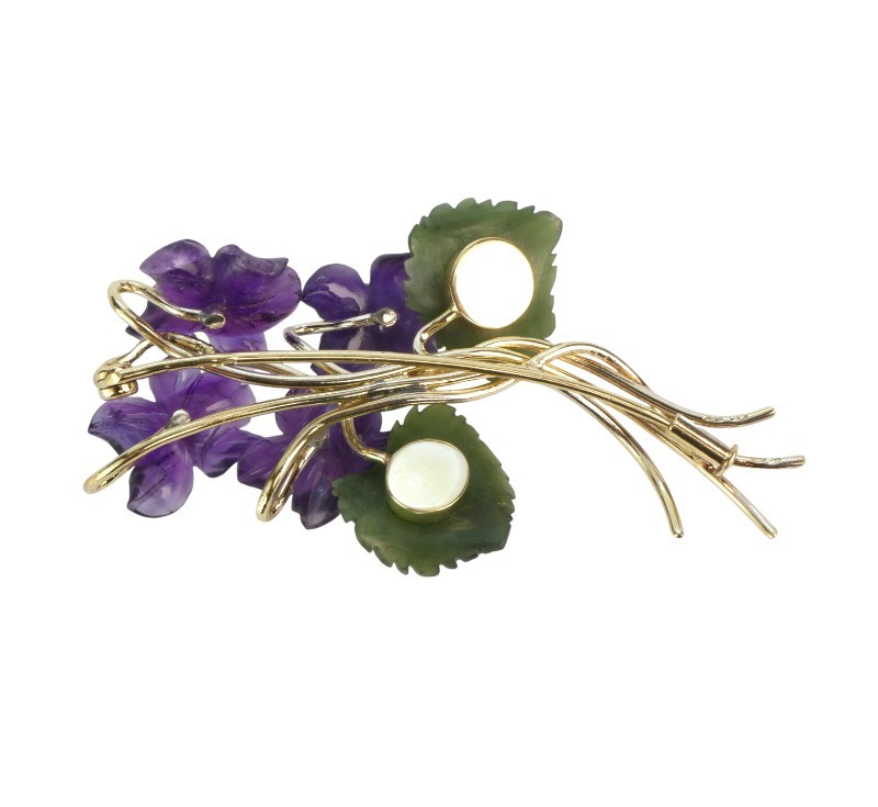 Brož ze žlutého zlata ryzosti 585/1000 ve tvaru svazku čtyř fialek. Okvětní lístky vyřezány z ametystu, lístky ze zeleného nefritu. Rozměr brože 6 x 3,5 cm, celková hmotnost 13,67 g.