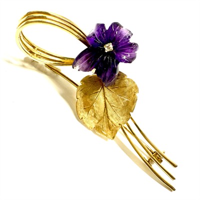 Elegantní, nevšedně ztvárněná, zlatá brož - fialka. Šperk byl vyroben ze 14ti karátového zlata (585/1000), o celkové váze 7,62 g. Zdobí jej ručně vyřezaný květ ze sytě fialového ametystu. Střed květu prozařuje briliant. Délka cca 6 cm. Označeno ryzostní, puncovní a autorskou značkou. Šperk byl profesionálně vyčištěn a je v perfektním stavu.