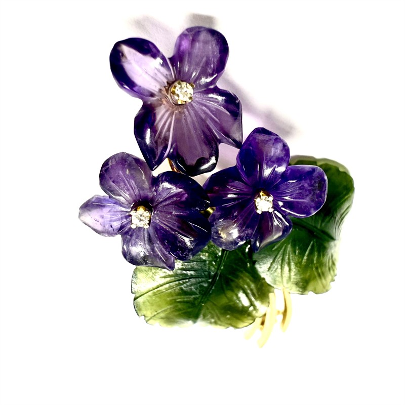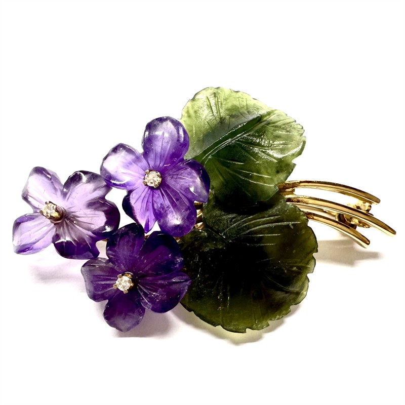 Velmi půvabná brož zdobená drahými kameny -fialky. Šperk byl zhotoven ze 14ti karátového zlata (585/1000), o celkové váze 7,87 g. Zdobí jej ručně vyřezávané ametysty sytého fialového odstínu, nefrity a brilianty. Rozměry cca 4,5 x 3 cm. Perfektní stav.