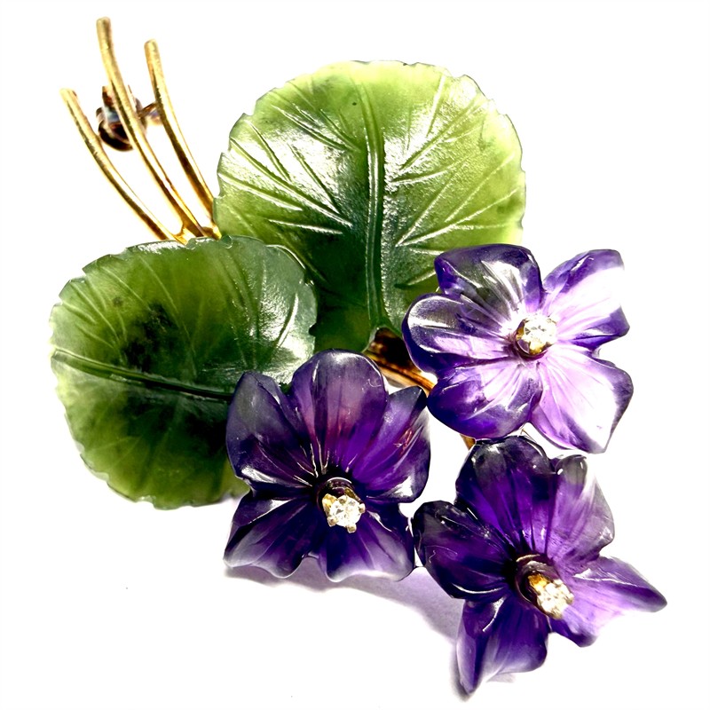 Ikonická brož ze 14ti karátového zlata - kytička fialek. Šperk zdobí ručně vyřezávané drahé kameny - na místě květů to jsou ametysty sytého fialového odstínu, na středu osazené brilianty. Listy vyřezány z nefritu. Šperk byl vyroben ze zlata ryzosti 14 karátů (585/1000). Celková váha 8,66 g. K broži je zhotoveno osvědčení Puncovního úřadu. Výborný stav.