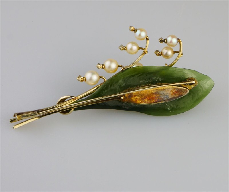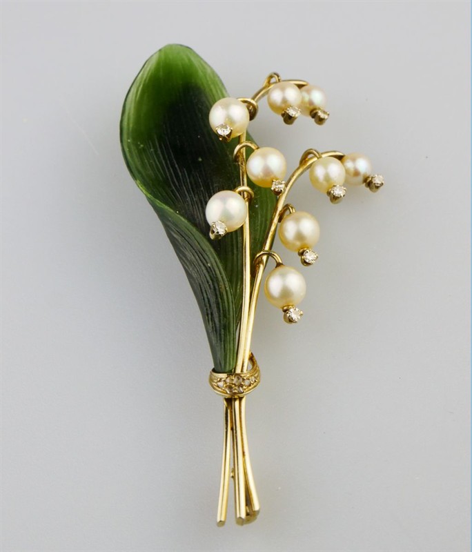 zlatá brož ve tvaru snítky konvalinek, kultivované perly, diamanty briliantového a routového brusu, list z nefritu, Au 13,66 g/750/1000, západní Evropa, kolem r. 1990, atest Puncovního úřadu, rozměry 8 x 3,5 cm