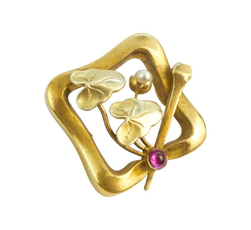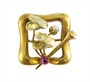 Drobná brož ze žlutého zlata ryzosti 585/1000 zdobená rubínkem a perličkou. Rozměry brože 1,9 x 1,9 cm, celková hmotnost 2,75 g. Ke šperku je vyhotoveno osvědčení Puncovního úřadu.
