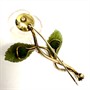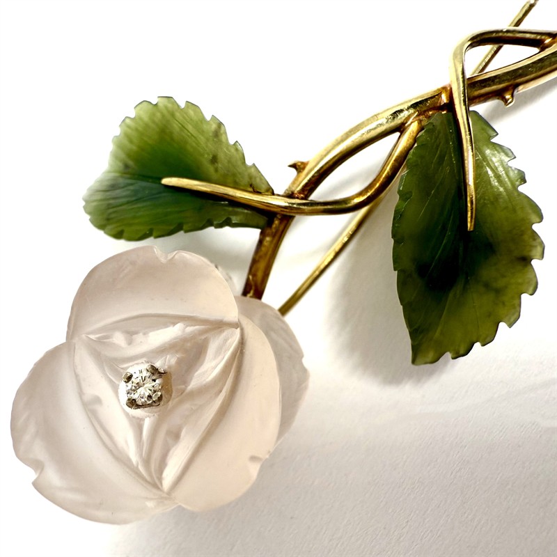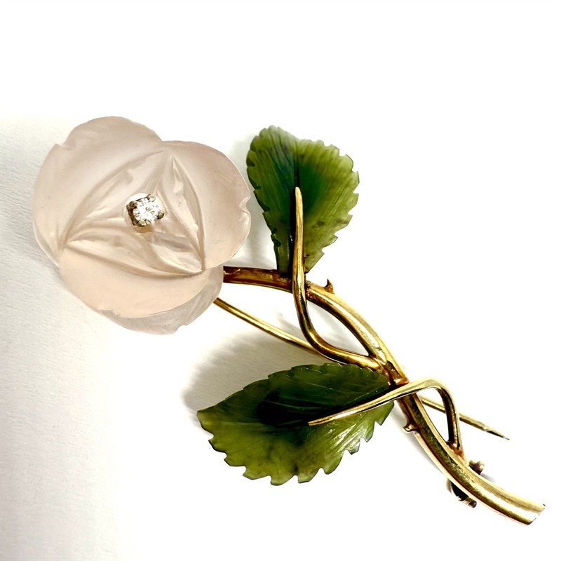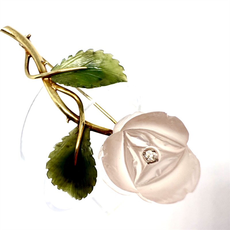 Velmi půvabná zlatá brož zdobená drahými kameny - růže. Květ byl zhotoven z ručně vyřezaného růženínu, střed osazen briliantem. Listy vyřezány z nefritu. Zlato o ryzosti 14karátů (585/1000), celková váha 12,20 g. Rozměry cca 6 x 4,5 cm. Značeno autorskou a ryzostní značkou, zhotoven certifikát Puncovního úřadu. Výborný stav.