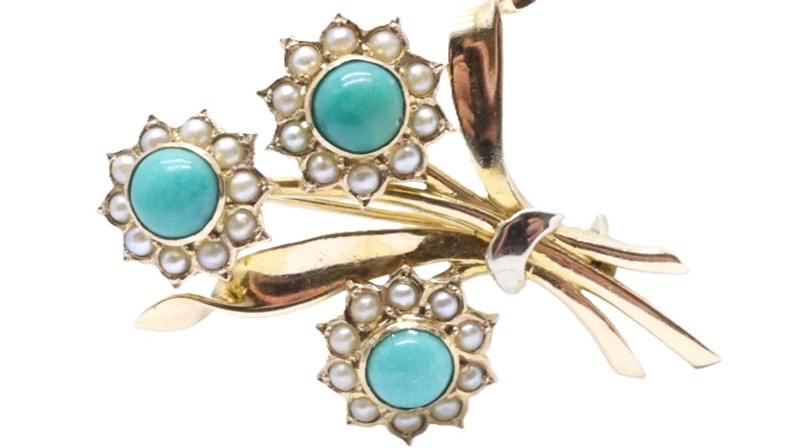 č. 179 990 Zlatá brož s tyrkysy a perličkami