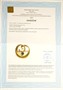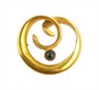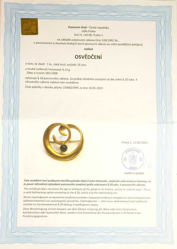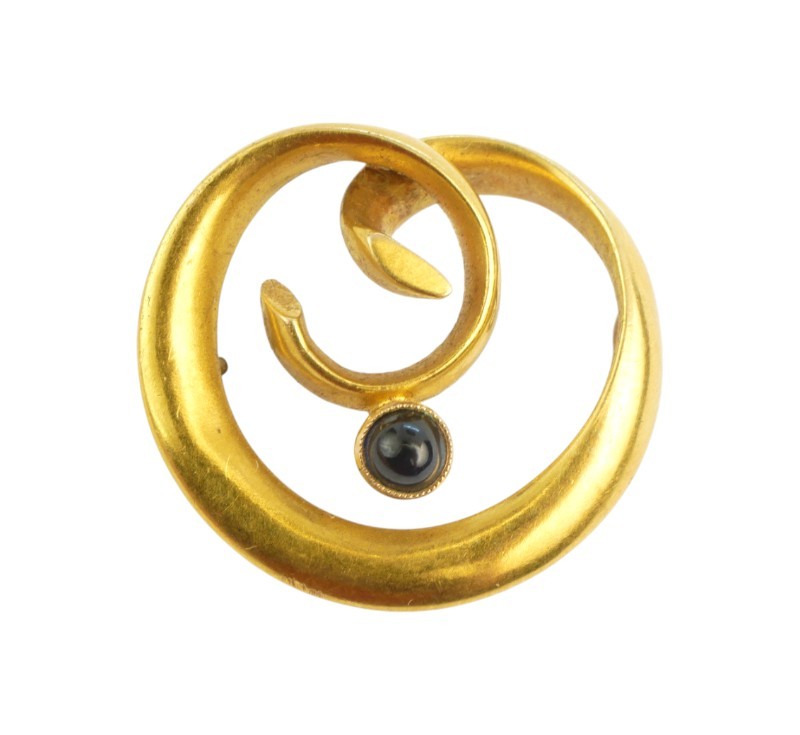 Nesmírně elegantní brož ze žlutého zlata ryzosti 585/1000 zdobená kabošonem temného safíru. Průměr brož 2,5 cm, celková hmotnost 4,15 g. Ke šperku je vyhotoveno osvědčení Puncovního úřadu.