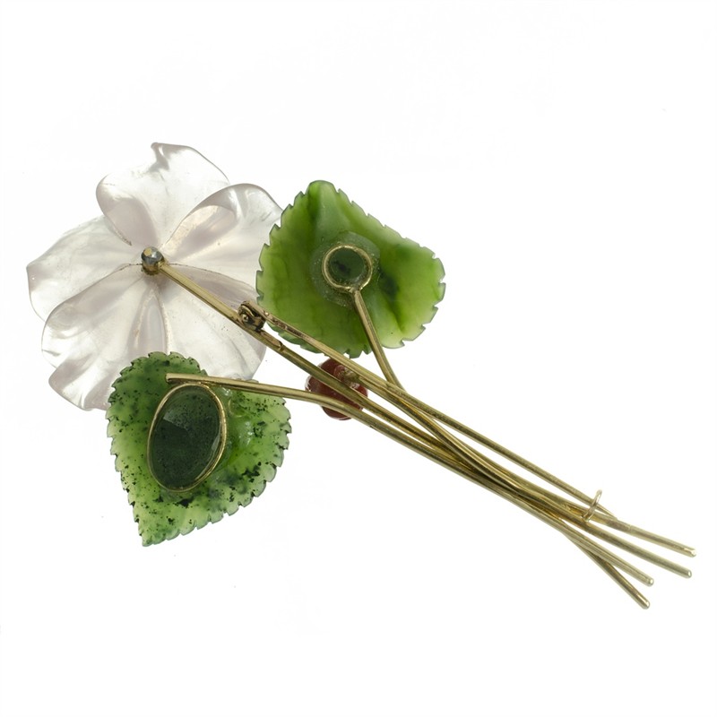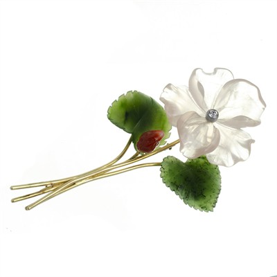 Brož ze žlutého zlata ve tvaru květiny. Okvětní lístky vyřezávané z růženínu, listy vyřezány z nefritu, zdobeno drobným briliantem a korálem. Zlato Au 585/1000, hmotnost: 27,40g. Briliant 0,10 ct. Čechy, 30. léta 20. století. Rozměry: 9,5 x 4 cm.