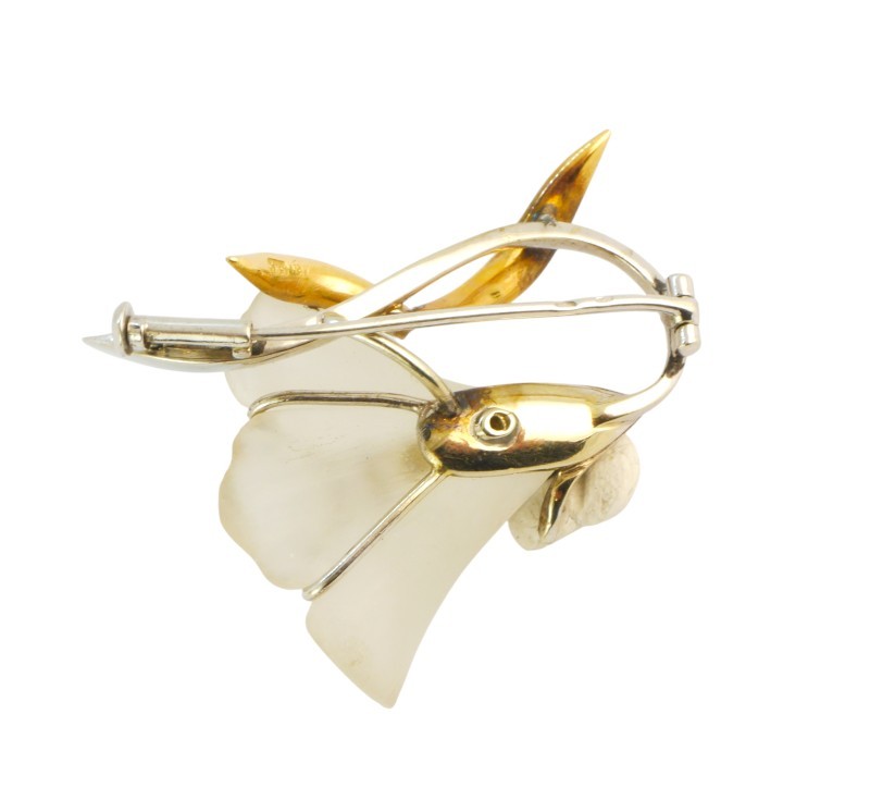 Brož ze žlutého a bílého zlata ve tvaru květiny. Kalich květu vyřezán z horského křišťálu, pestíky doplněny drobnými rubíny a brilianty. Zlato ryzost 585/1000, hmotnost: 10,55 g. Rozměry: 4 x 3 cm.
