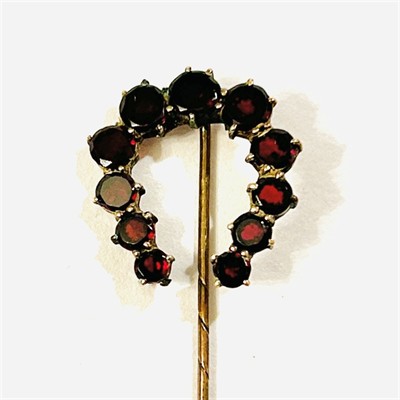Větší, elegantní jehlice s hlavicí ve tvaru podkovy, která je tvořena stupňovitě velkými přírodními granáty a českými pyropy kulatého plochého brusu, fasováno krapnami. Variabilně nositelný šperk do kravaty/šátku či klopy, s oblíbeným motivem štěstí. Tuzemská granátnická práce z poslední pětiny 19. století. Zhotoveno z narůžovělého 4,3 karátového zlata, tj. o ryzosti 180/1000; neznačeno. Hmotnost 2,19 g, celková délka 61 mm, délka hlavice 20 mm, šířka 19 mm. Nečištěno, v zachovalém stavu.
