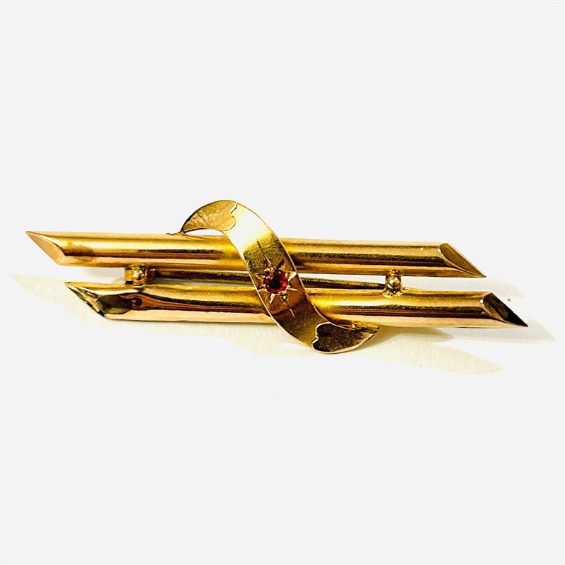 Elegantní brož ve stylu pozdního biedermeieru, tělo složeno z dvou souběžných zkosených dříků, spojenou ladně vinutou páskou osazenou rubínovým kamenem fasovaném v hvězdicovém lůžku. Kontrastní plochy leštěného kovu a potažení matným dukátovým zlatem. Britská (Birmingham) zlatnická práce z poslední čtvrtiny 19. století. Zhotoveno z narůžovělého žlutého 9 karátového zlata, tj. o ryzosti 375/1000, jehla z obecného kovu; britské puncovní značení, ryzostní číslo a značka výrobce "BA&Co." zespoda. Hmotnost 2,63 g, celková délka 50,5 mm, šířka 15,5 mm. V jednom bodě brož poškozena a opravována letováním, tělo lehce prohnuté (není při nošení patrné), zohledněno v ceně.