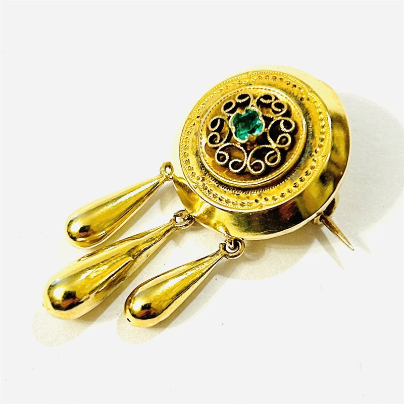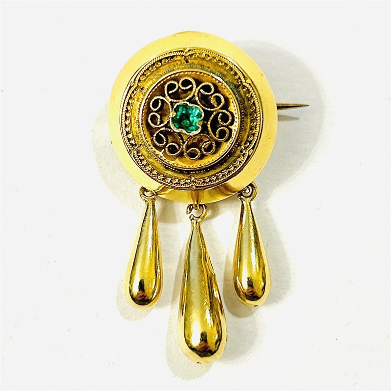 Elegantní, menší, přesto honosně působící brož z období pozdního biedermeieru, kulatá hlavice ve středu osazena zeleným sklem imitující smaragd, jemná volutová aplikace obklopena decentním rytím, připojeny tři kapkové ověsky. Kvalitní rakousko-uherská zlatnická práce z 60. až 70. let 19. století. Zhotoveno ze sytě žlutého 14 karátového zlata, tj. o ryzosti 580/1000; rakousko-uherský punc Z-27 (liška 4) zezadu. Hmotnost 2,70 g, délka 36,5 mm, šířka 18,5 mm. Zapínání na „C“ sponu v pořádku, místy lehké promáčkliny, není příliš patrné, celkově v dobrém stavu, odborně vyčištěno a vyleštěno zlatníkem.
