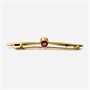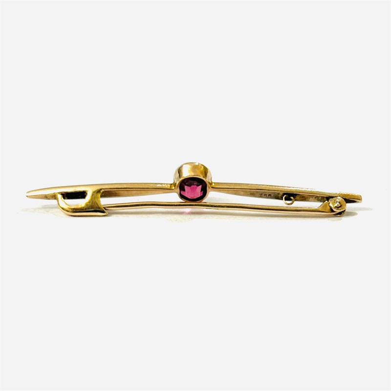 Decentní, elegantní podlouhlá brož z období secese, dynamicky tvarovaná ramena uprostřed osazeny v zrnité obrubě přírodním almandinem (se silným fialovým nádechem) oválného brusu. Kvalitní západoevropská zlatnická práce z první pětiny 20. století. Zhotoveno z narůžovělého žlutého zlata, zapínací spona z 18 karátového, tj. o ryzosti 750/1000, tělo z 9 karátového, tj. o ryzosti 375/1000; nově opatřeno puncem Z-59 (písmeno Z s alchymistickou růží) a ryzostní číslo zespod. Hmotnost 3,19 g, délka 56 mm, šířka 8 mm. Zapínání na nepůvodní špendlíkovou sponu v pořádku, celkově v zachovalém stavu.