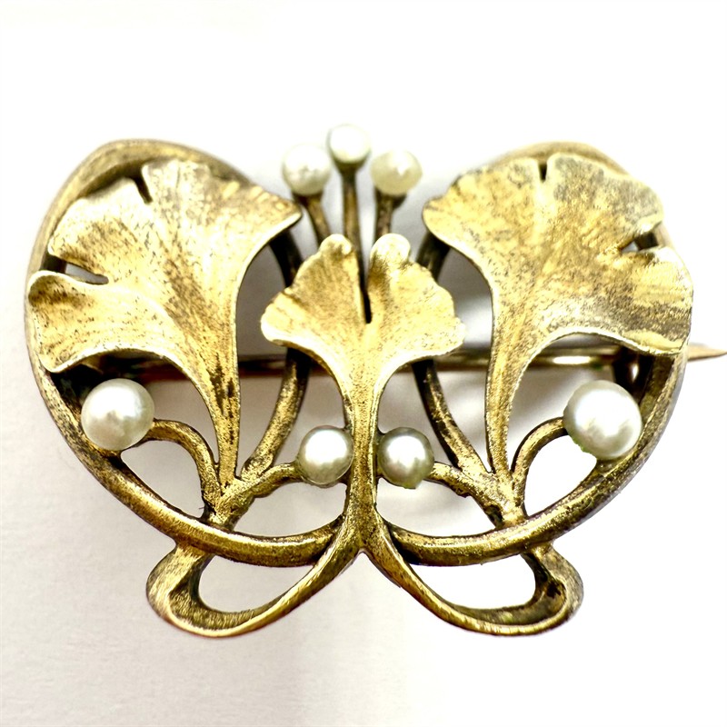 č. 180 263 Zlatá secesní brož s říčními perlami - ginkgo biloba