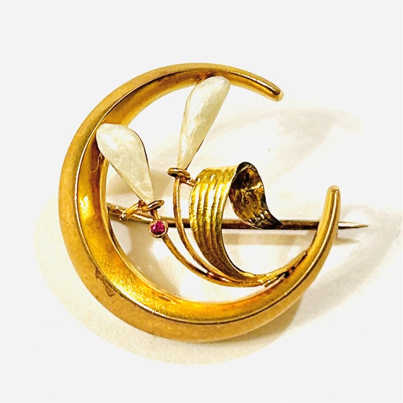 Velice půvabná brož z období secese, tělo ve tvaru srpku měsíce s ladným florálním motivem, osazeno drobným přírodním rubínem kulatého brusu a 2 přírodními říčními perlami, jež vynikají svým organickým tvarem. Efektně potaženo matným dukátovým zlatem. Precizní německá zlatnická práce z počátku 20. století. Vyrobeno technikou dutého kovu. Zhotoveno z narůžovělého žlutého 8 karátového zlata, tj. o ryzosti 333/1000; vyhotoveno osvědčení puncovního úřadu, ryzostní číslo zezadu. Hmotnost 2,50 g, délka 23 mm. Ponecháno s lehkou přirozenou patinou, lze vyčistit, celkově ve velmi zachovalém stavu.