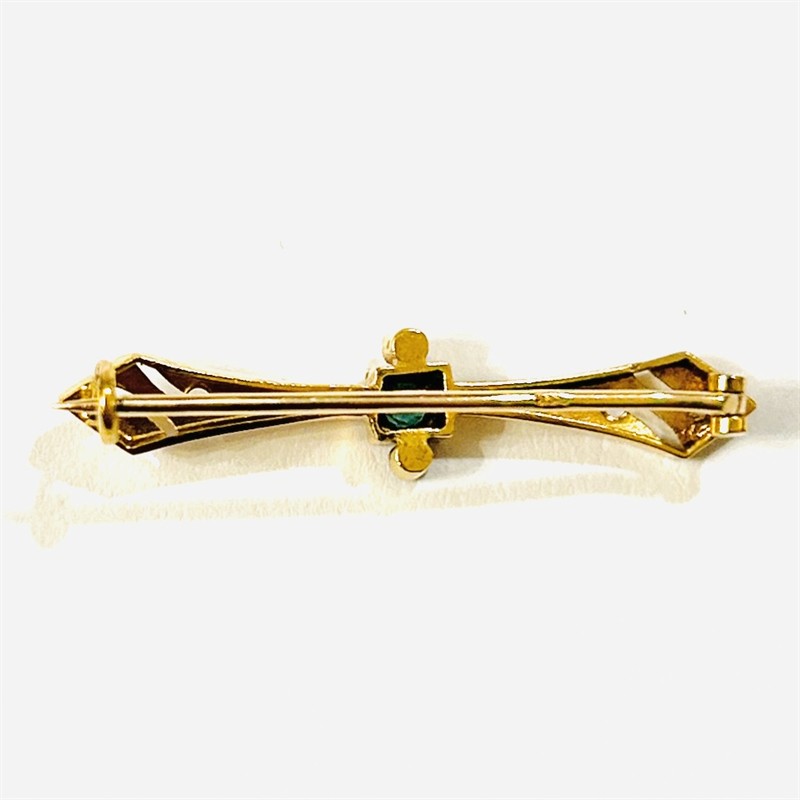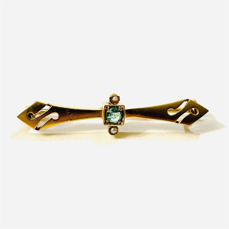 Elegantní, decentní brož z období secese, ve středu osazeno přírodní smaragdem kulatého brusu, po stranách doplněno drobnými přírodními perlami, fasováno v lůžkách. Dynamicky tvarovaná ramena v závěru efektně prořezávána. Kvalitní západoevropská zlatnická práce z počátku 20. století, dovezeno na území monarchie ve stejném období. Zhotoveno z narůžovělého žlutého 14 karátového zlata, tj. o ryzosti 585/1000; rakousko-uherský dovozový punc Z-29 (AV) s písmenem "A" (značící vídeňský puncovní úřad) na jehle a sponě. Hmotnost 1,51 g, délka 32 mm, šířka 7 mm. Zapínání na "C" sponu v pořádku, na jednom rameni setřeno dukátové zlacení, celkově v zachovalém stavu, odborně vyčištěno restaurátorkou Monikou Zemanovou, DiS.