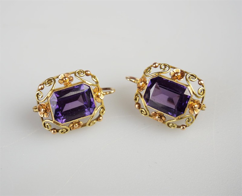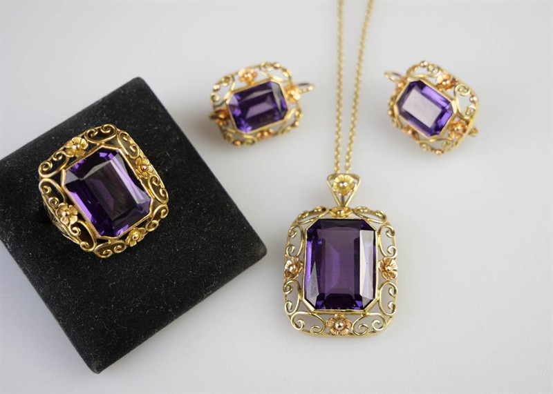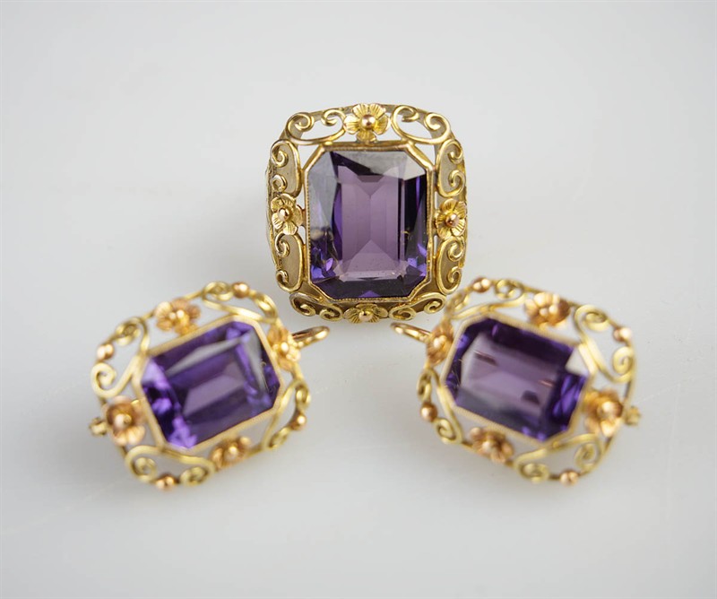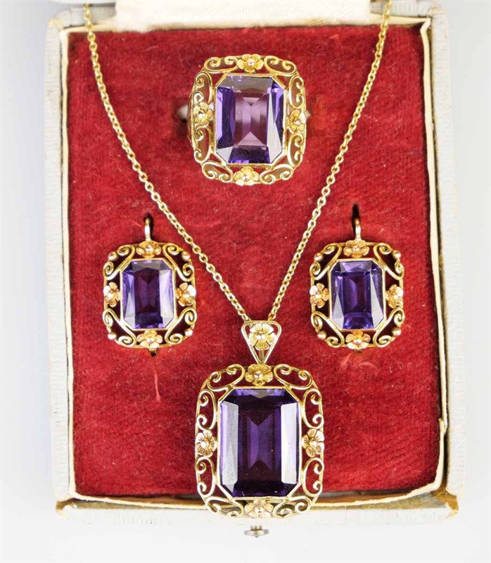 zlatá souprava se syntetickými safíry s barvoměnou, náušnice, kolier a prsten, Au 25,50 g/585/1000, Československo, kolem r. 1935, dobový punc (lvíček), u náušnic atest Puncovního úřadu; rozměry náušnic 1,6 x 2,2 cm, rozměry kolieru 3,5 x 2,3 cm, rozměry hlavy prstenu 2,2 x 2 cm; velikost prstenu 55, délka řetízku 46 cm.
