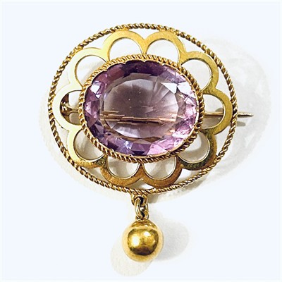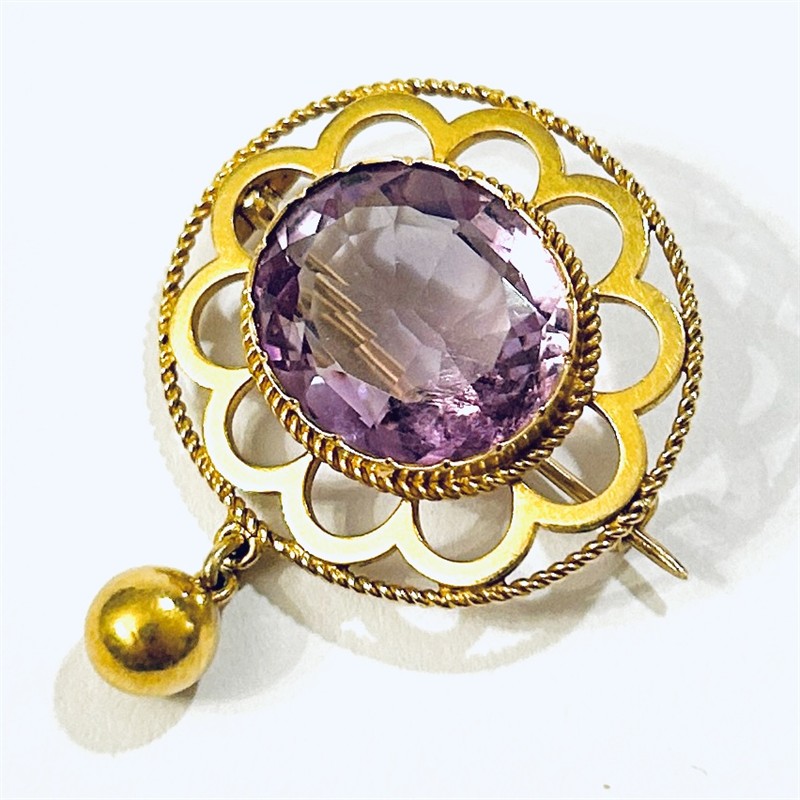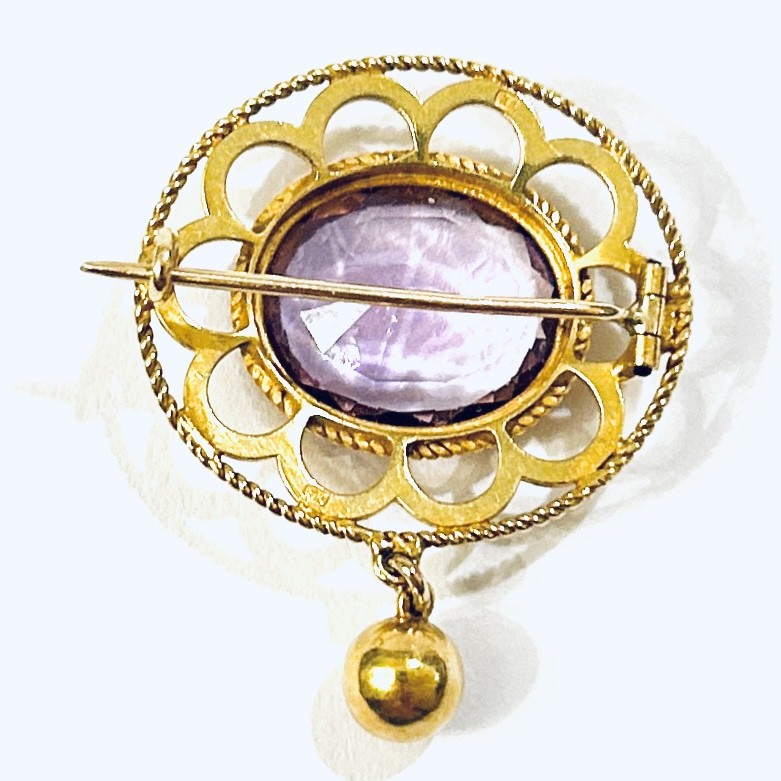 Elegantní, starožitná brož osazena přírodním světlejším ametystem oválného brusu, fasováno v plně přiléhající obrubě, tělo s prořezávanými vzdušnými obloučky, dvojitě rámováno pletencem, doplněno decentním ověskem v podobě hladké kuličky. Nevšední design, precizní rakousko-uherská zlatnická práce ze 70. až 80. let 19. století. Zhotoveno z narůžovělého žlutého 14 karátového zlata, tj. o ryzosti 580/1000; rakousko-uherský punc Z-27 (liška 4) a mistrovská značka "FK" na sponě, jehle a zezadu. Hmotnost 4,97 g, délka 33,5 mm, šířka 26,5 mm. Zapínání na „C“ sponu v pořádku, celkově ve velmi zachovalém stavu.