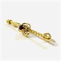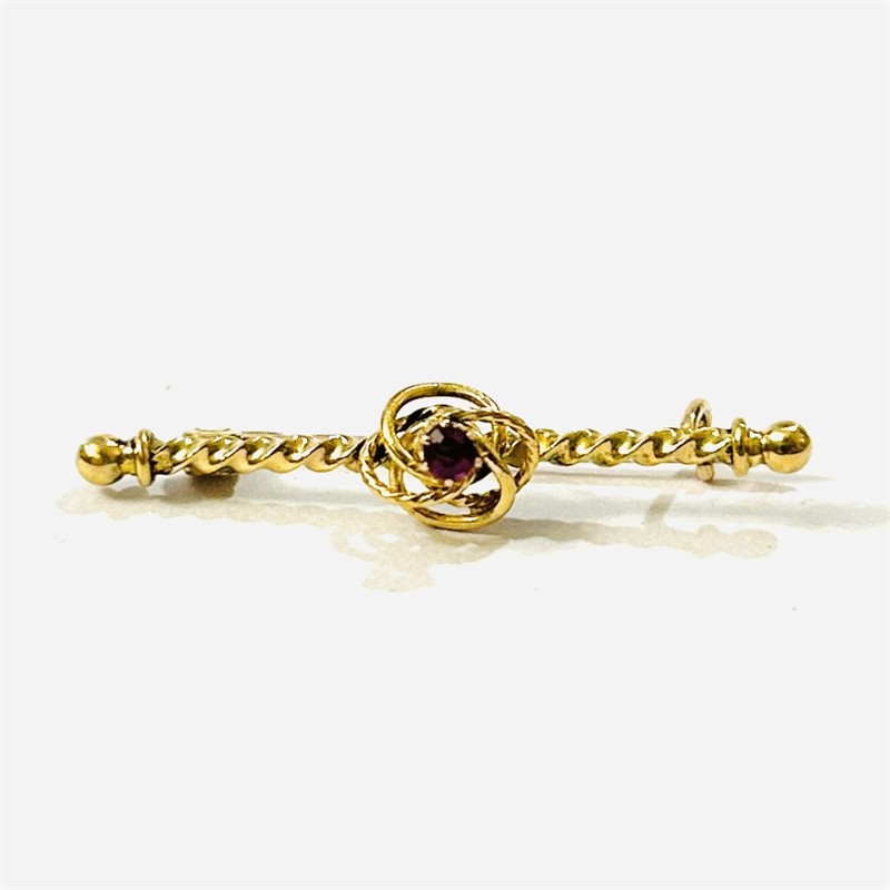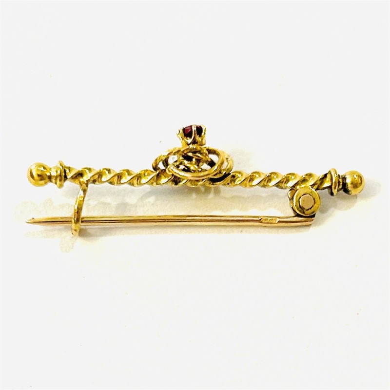 Elegantní, decentní brož, jejíž tělo je tvořeno tordovaným dříkem s koncovými kuličkami, hlavice v podobě prostorově efektního uzle osazeným v mnohokraponové koruně přírodním rubínem kulatého brusu. Detailně zpracováno, kvalitní západoevropská zlatnická práce z konce 19. století, dovezeno na území monarchie ve stejném období. Zhotoveno z narůžovělého žlutého 14 karátového zlata, tj. o ryzosti 585/1000; rakousko-uherský dovozový punc Z-29 (AV) s písmenem "A" (značící vídeňský puncovní úřad) na jehle. Hmotnost 1,30 g, délka 31 mm, šířka 6 mm. Zapínání na "C" sponu v pořádku, ve velmi zachovalém stavu, odborně vyčištěno vyleštěno zlatníkem.