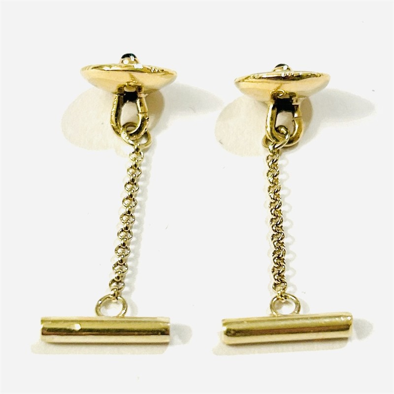 Decentní, drobnější manžetové knoflíčky z období art-deco, hlavice osazeny diskem z přírodní bílé perleti, ve středu kulatou muglí přírodního modrého safíru, rámeček s jemným rytmickým reliéfem. Kvalitní západoevropská zlatnická práce z 20. let 20. století. Zhotoveno ze žlutého 14 karátového zlata, tj. o ryzosti 585/1000; prvorepublikový dovozový punc (lyra s Č) na oušku. Hmotnost 3,29 g, celková délka 32,5 mm, patka 12 mm, průměr hlavice 10 mm. Současně přidaný řetízek s patkou, celkově ve velmi zachovalém stavu, odborně vyčištěno a vyleštěno zlatníkem.