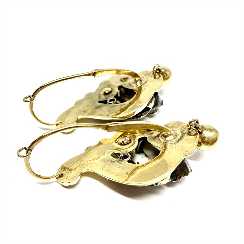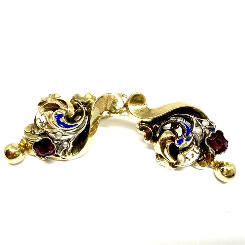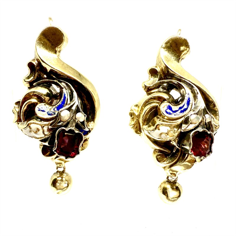 Monumentální náušnice zhotovené v období biedermeieru. Vyrobeny ze 14ti karátového zlata (585/1000) a zdobí jej almandin, dvě říční perly a smalt. Almandin je zasazen do lůžka z téměř ryzího stříbra (980/1000). Náušnice měří 3,8 cm, jsou zakončeny kinetickým ověsem ve tvaru kuličky. Váha 6,04 g. Zhotoveno osvědčení puncovního úřadu. Výborný stav.