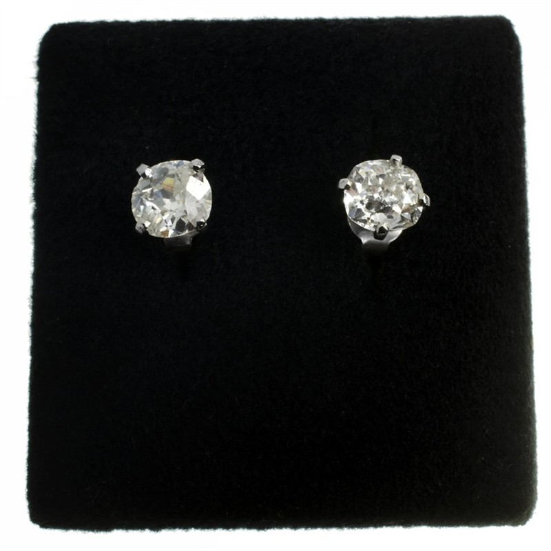 Náušnice z bílého zlata zdobená solitérními brilianty o celkové velikosti 2,15 ct (1. briliant 1,16 ct čistota VS2, barva G-H, 2. briliant 0,99 ct, kvalita P1, barva G). K dispozici znalecký posudek od dr. Hyršla. Au 750/1000, hmotnost: 1,69g. Čechy, 20. léta 20. století. Průměr kamene: cca 0,65 cm.